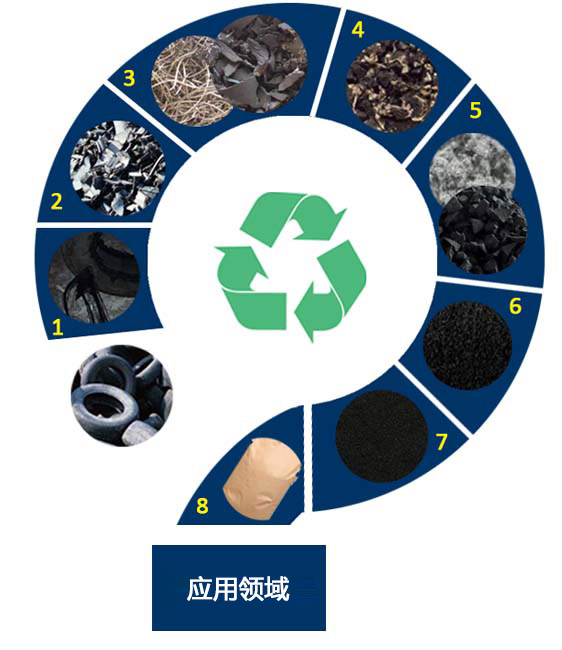 废旧轮胎资源十分丰富,同时废旧轮胎又是巨大的再生资源,可以变废为宝。通过全自动轮胎破碎回收设备线的分离和破碎等工序,将各种废弃橡胶制品粉碎成颗粒,以实现废旧橡胶的回收再利用。生产出来的橡胶胶粉与颗粒可广泛应用于机场跑道、体育场跑道、学校操场、高速公路改性沥青等,也可将胶粉经过高温、高压脱硫转化成生胶制作胶管、胶鞋、橡胶输送带、橡胶地砖、轮胎等制品,也可用于只制做公路上的减速带。